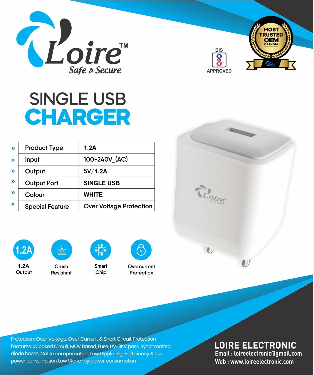 Features : IC based Circuit, MOV Based Fuse, HV-3KV Pass, Synchronized Diode Based Cable Compensation, Low Ripple, High-Efficiency & Low Power Consumption, Low Stand By Power Consumption.