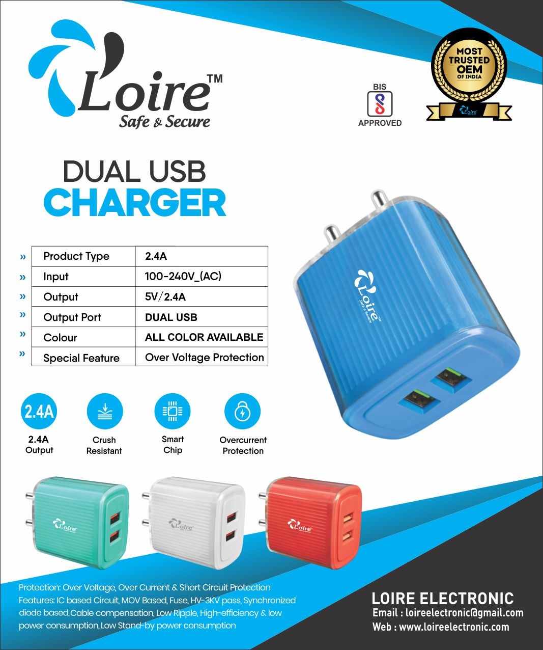 Loire (Safe & Secure) 2.4A Dual USB Charger (Multicolour)