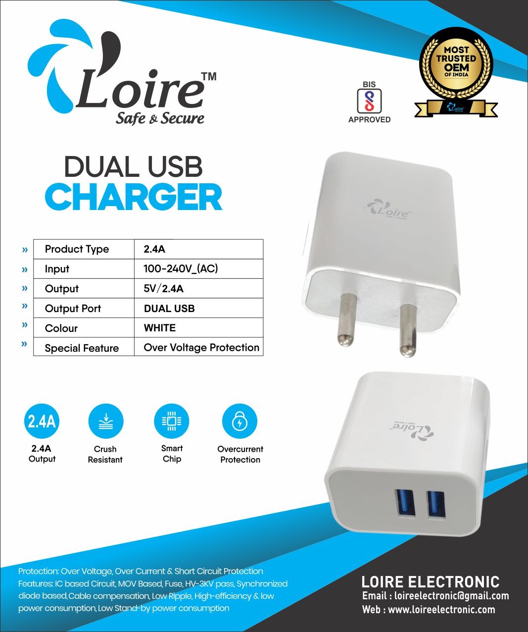 Loire (Safe & Secure) 2.4A Dual USB Charger (White)
