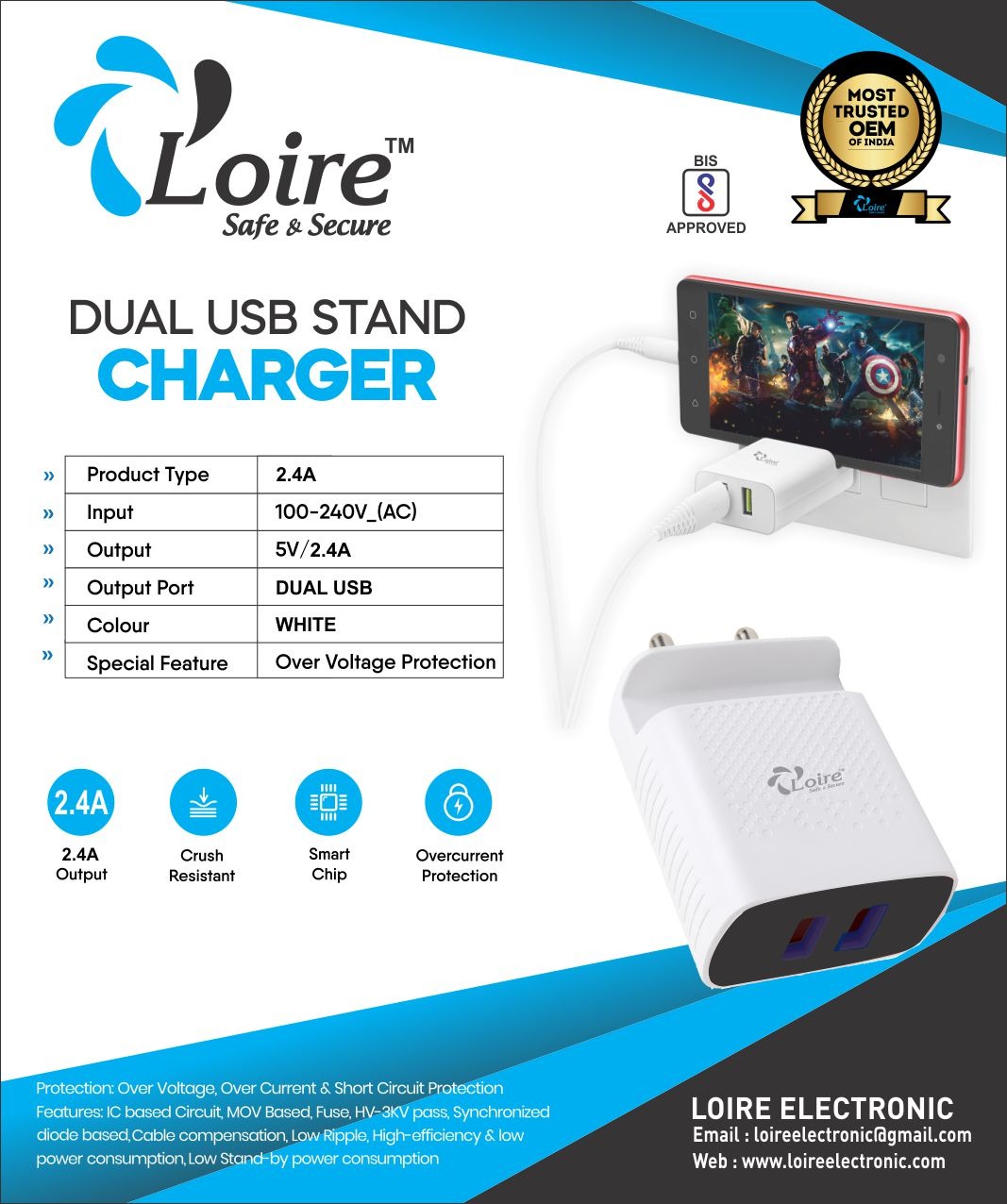 Loire (Safe & Secure) 2.4A Dual USB Charger with Mobile Stand (White)